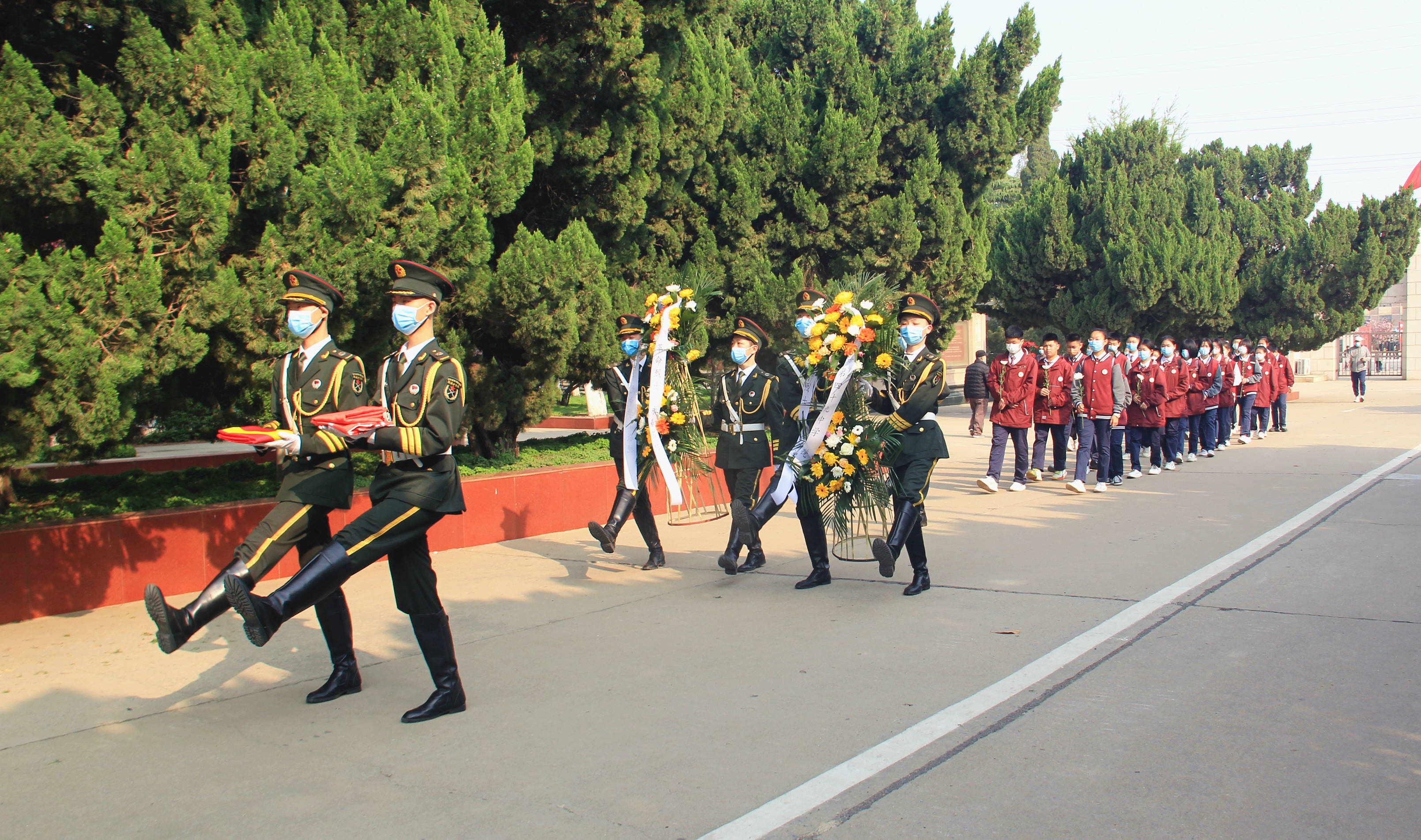 郑州49中师生代表整齐列队,缓步走向烈士纪念碑。