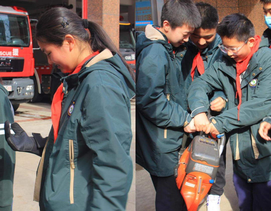 在实践体验环节,同学们穿上了消防服,亲身体验了一把当消防员的感觉。尽管装备限制了行动灵活性,但亲身体验让大家真切感受到消防员工作的艰辛。当申队长告诉同学们这套消防服他们在出任务时需要13秒的时间穿好时,同学们既惊讶又佩服。