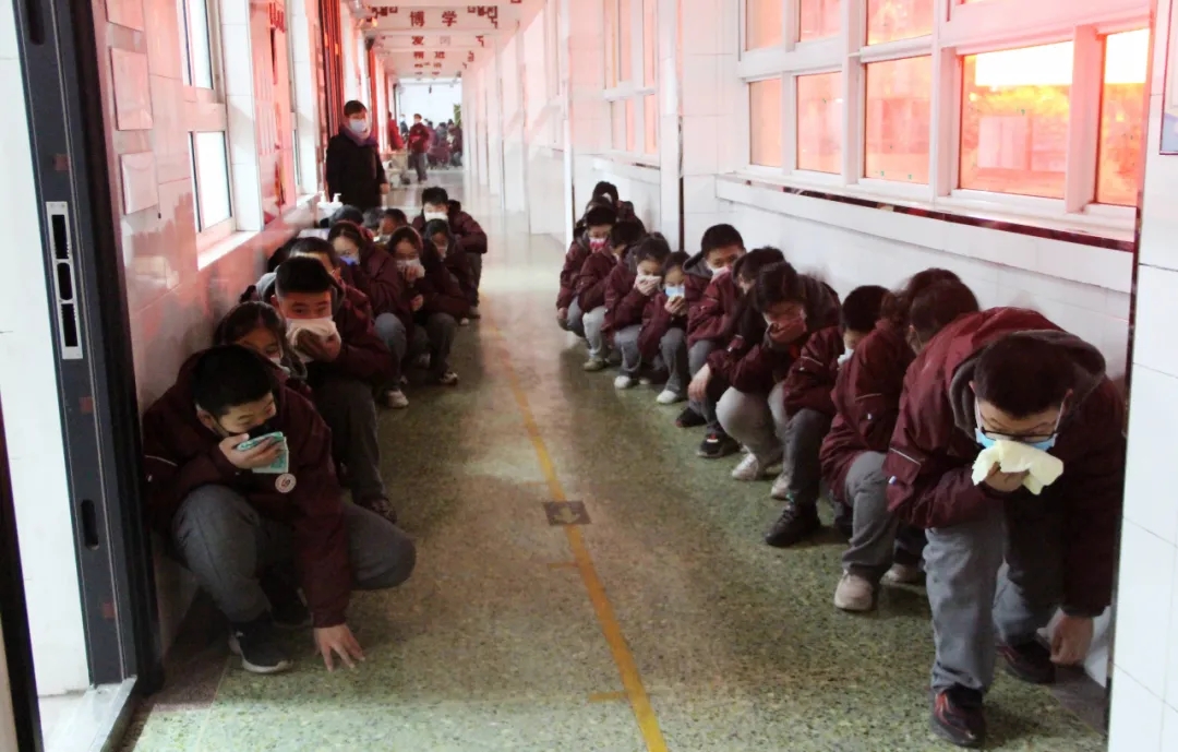 18点10,随着消防报警声的响起,全校近600名学生在老师的指引下,用湿毛巾捂住口鼻,弯腰捂鼻快速有序地按照规定的逃生路线撤离到学校操场。学生安全撤离到操场后,各班老师迅速清点本班学生人数,并立即报告校领导,整个演习用时1分56秒。