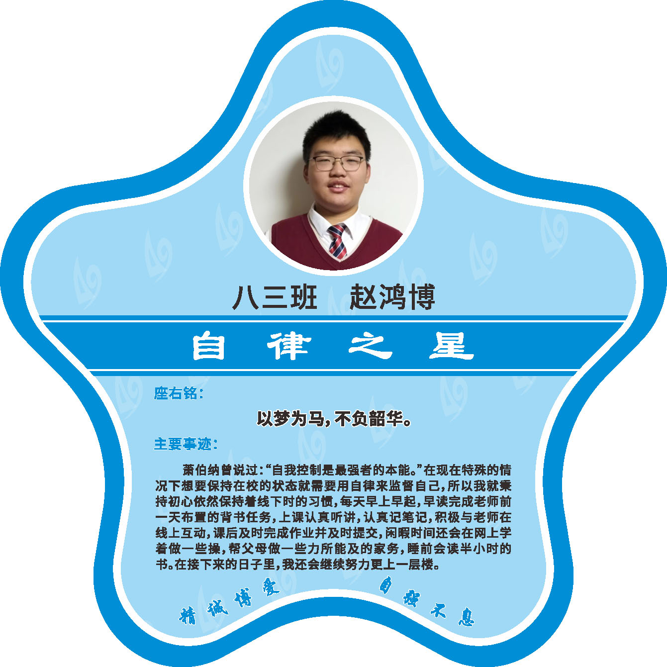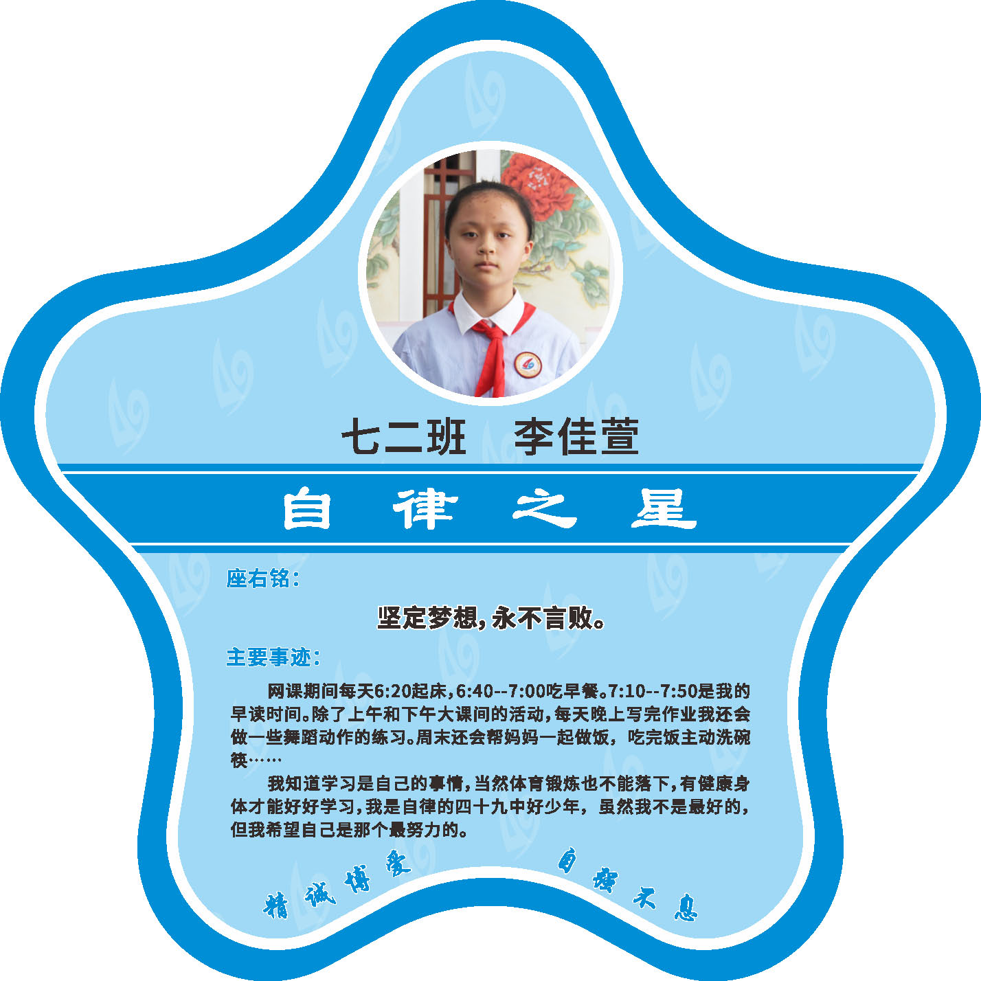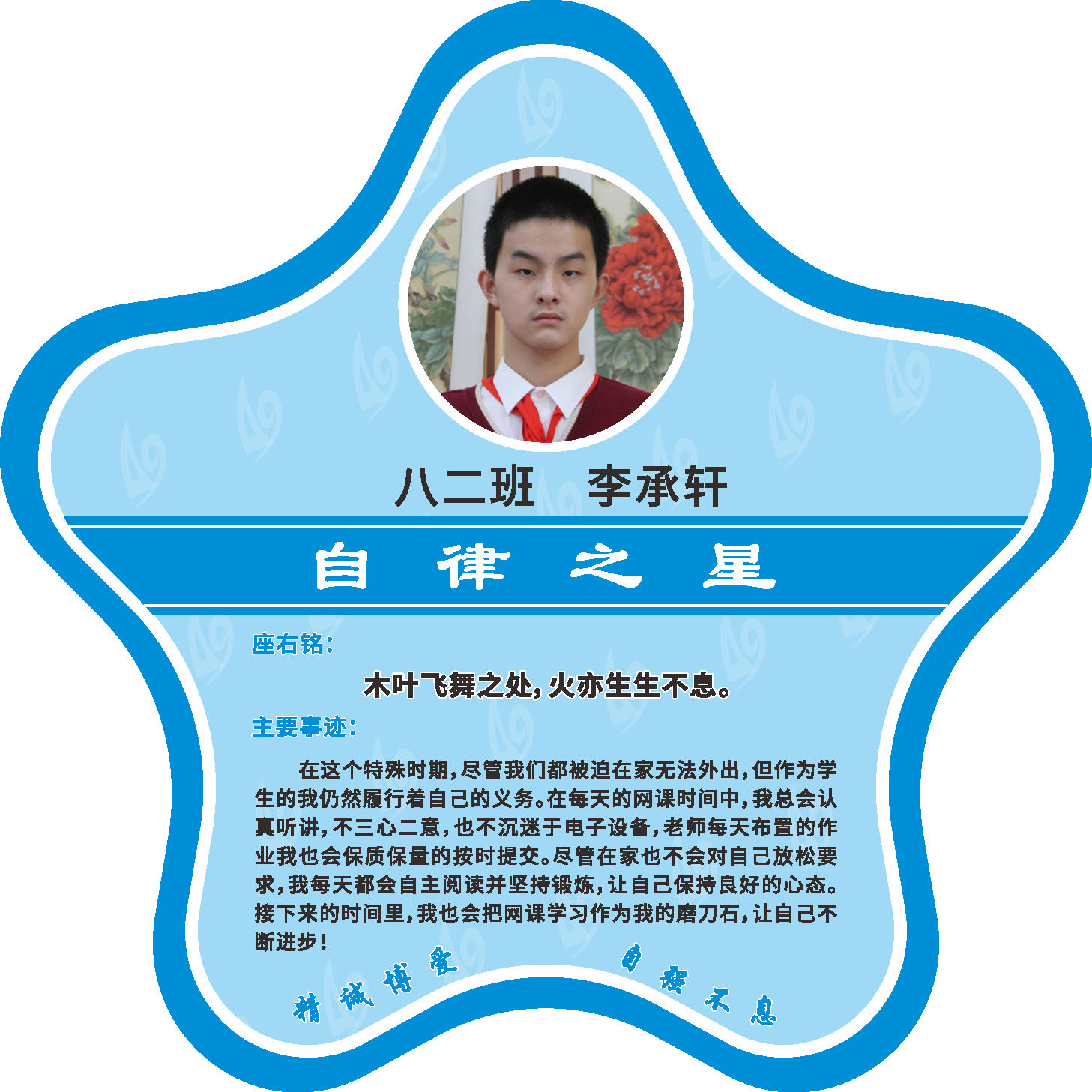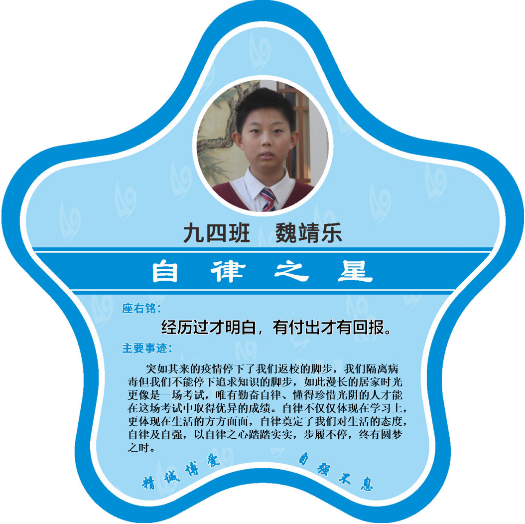 有明确的居家学习生活计划,并严格执行。认真有效的预习、 听课、复习,按时完成各项作业,合理使用电子设备,每天坚持阅读和体育锻炼。生活积极乐观,承担力所能及的家务,有自己的一项兴趣爱好,并为之付出努力。现经个人申报,班级推荐,学校审核,评选出2022年10月《自律之星》。