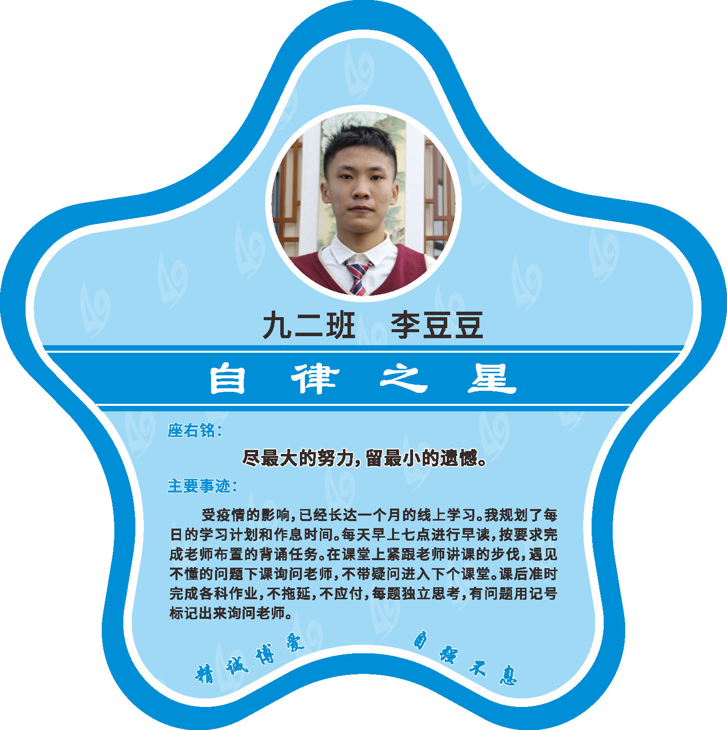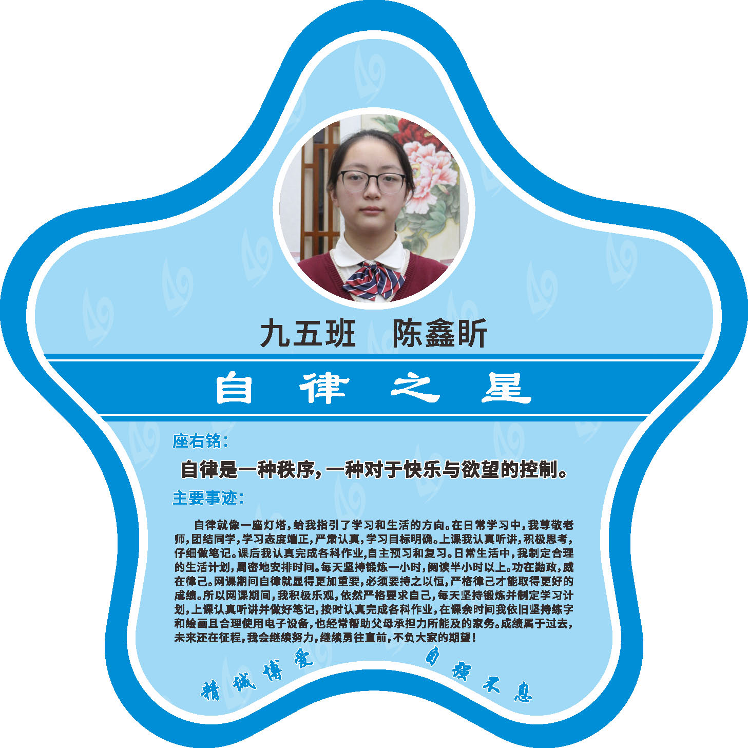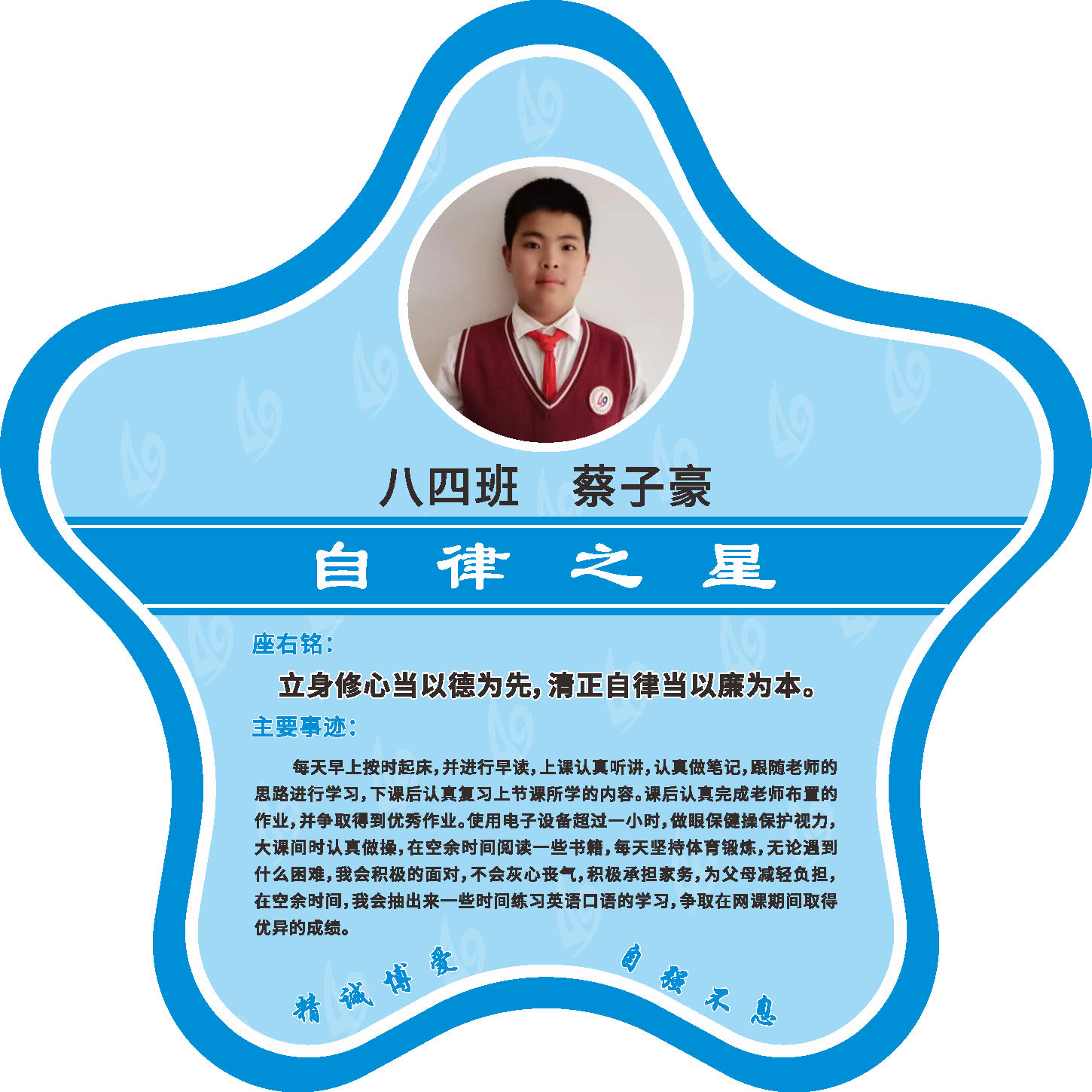 有明确的居家学习生活计划,并严格执行。认真有效的预习、 听课、复习,按时完成各项作业,合理使用电子设备,每天坚持阅读和体育锻炼。生活积极乐观,承担力所能及的家务,有自己的一项兴趣爱好,并为之付出努力。现经个人申报,班级推荐,学校审核,评选出2022年10月《自律之星》。