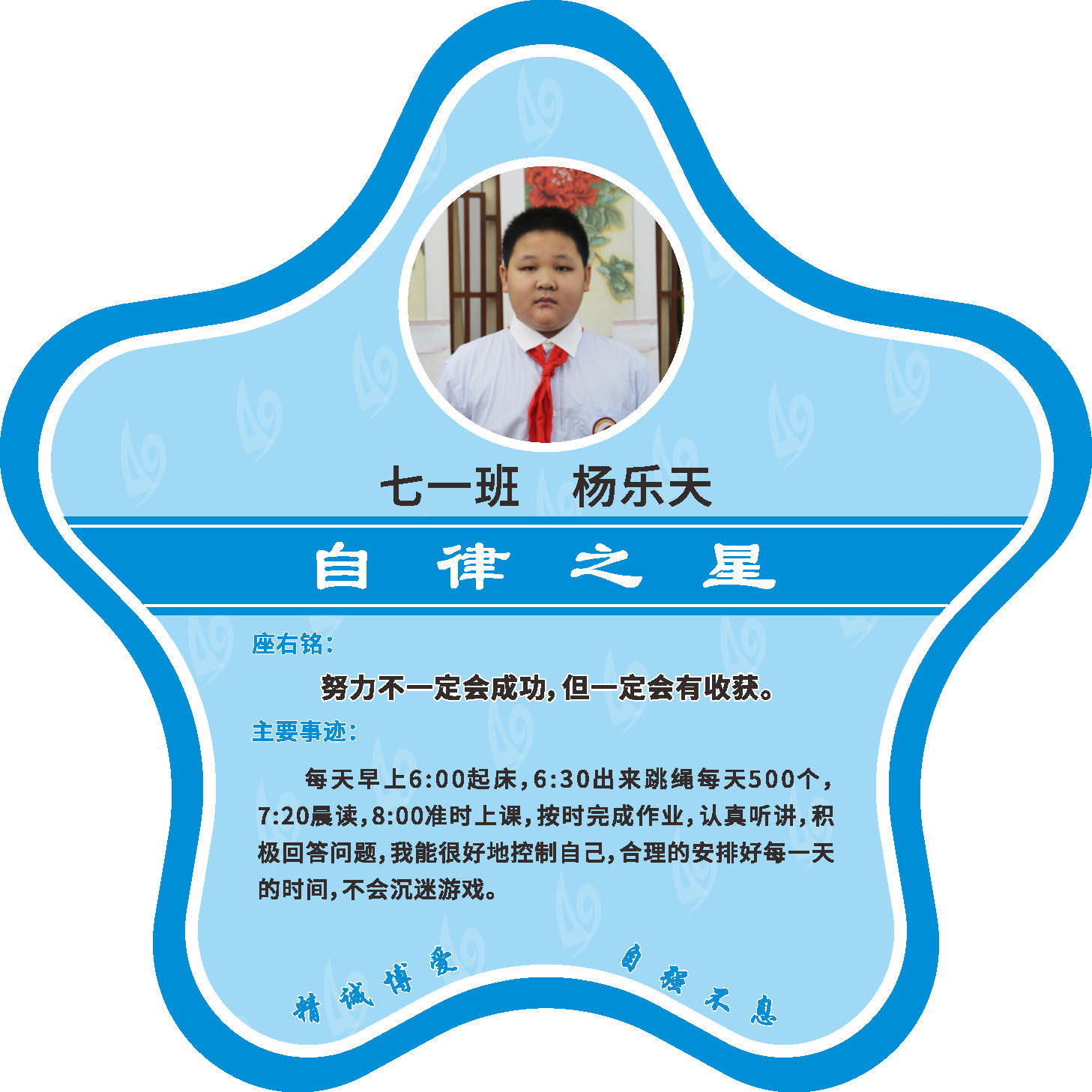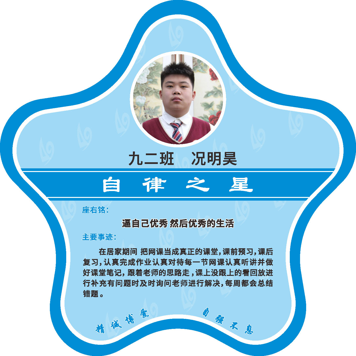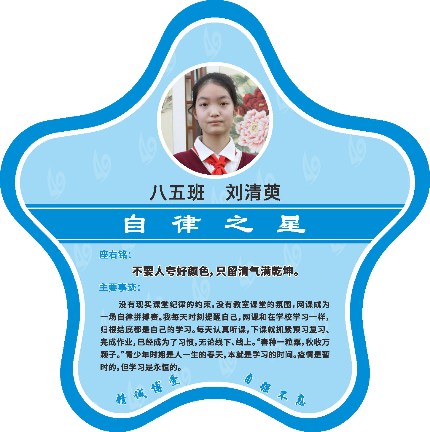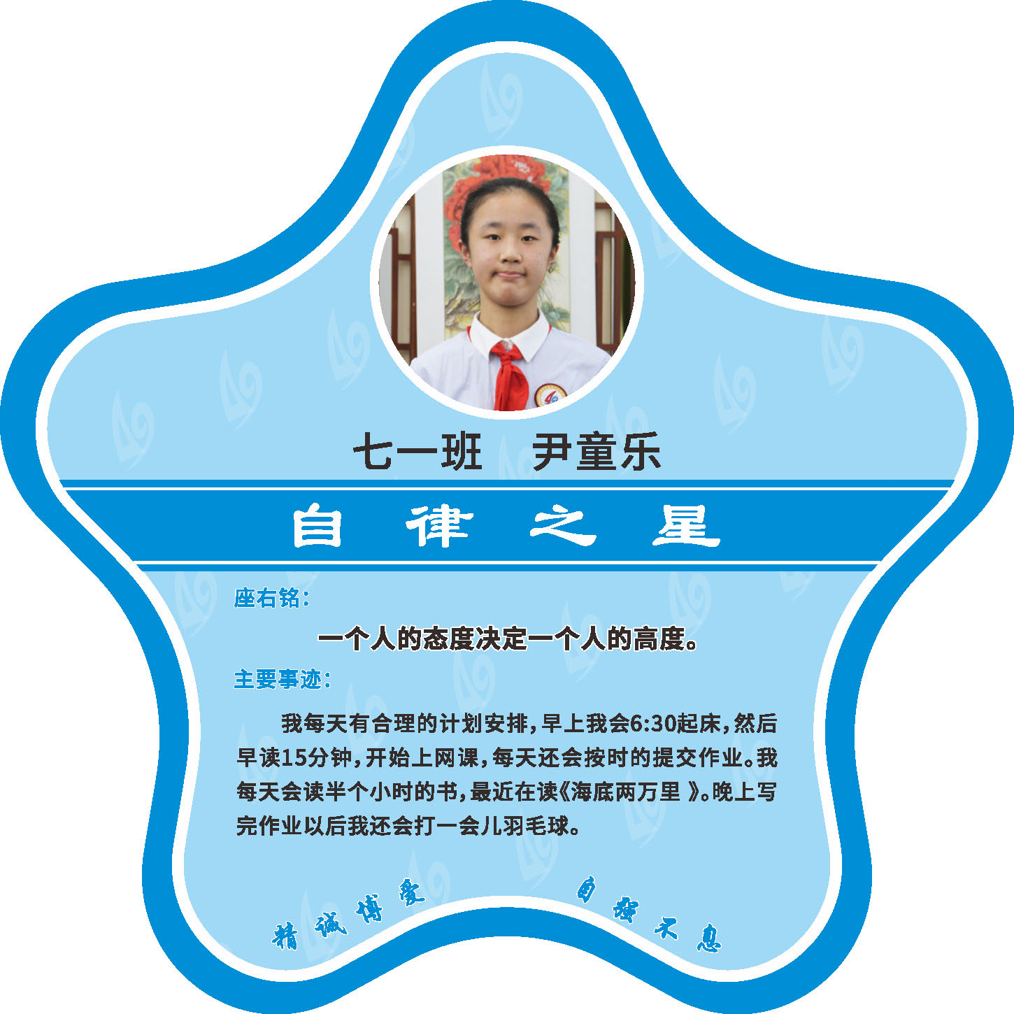 有明确的居家学习生活计划,并严格执行。认真有效的预习、 听课、复习,按时完成各项作业,合理使用电子设备,每天坚持阅读和体育锻炼。生活积极乐观,承担力所能及的家务,有自己的一项兴趣爱好,并为之付出努力。现经个人申报,班级推荐,学校审核,评选出2022年10月《自律之星》。
