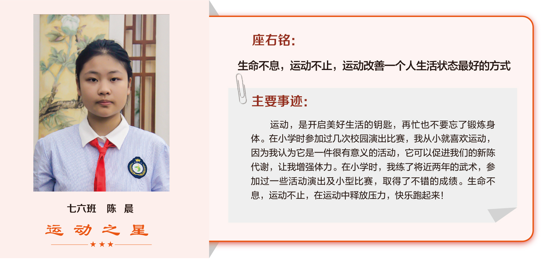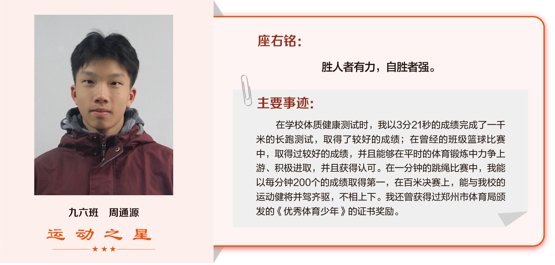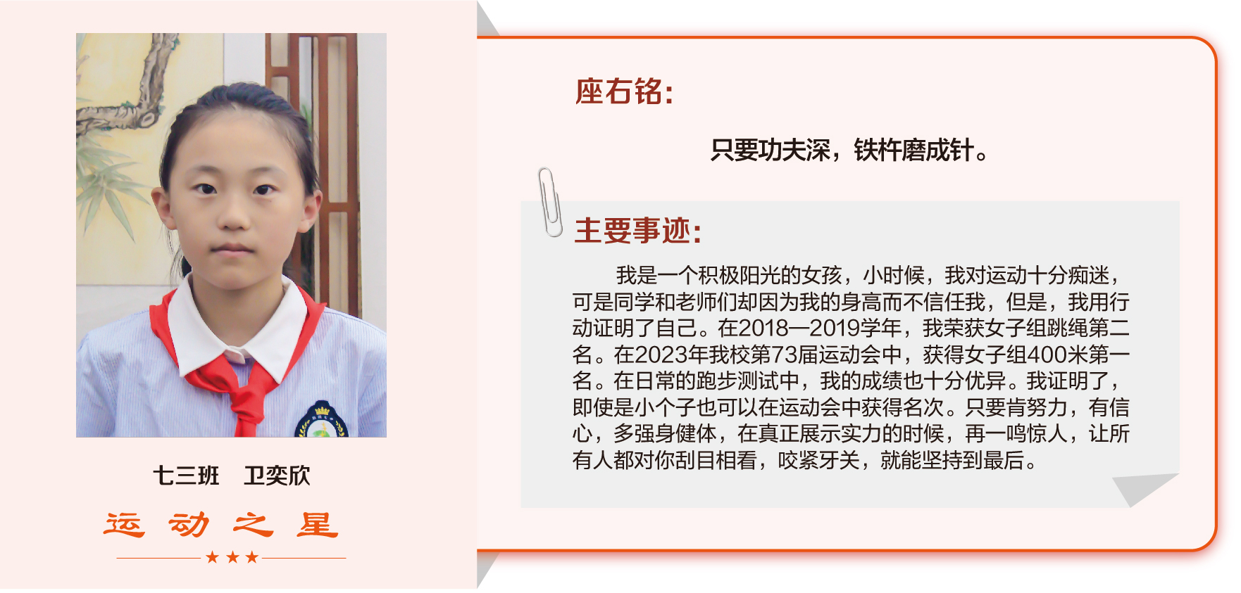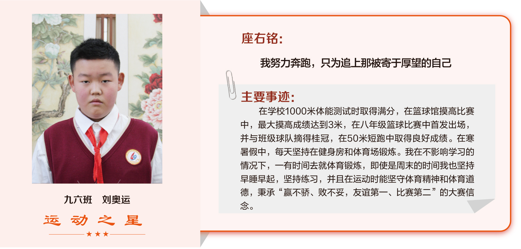 他们在运动会期间为班级争光,奔跑在运动场上,他们认真做眼保健操,大课间整齐跑步,口号响亮,经个人申报,班级推荐,学校审核评选出本期《运动之星》。