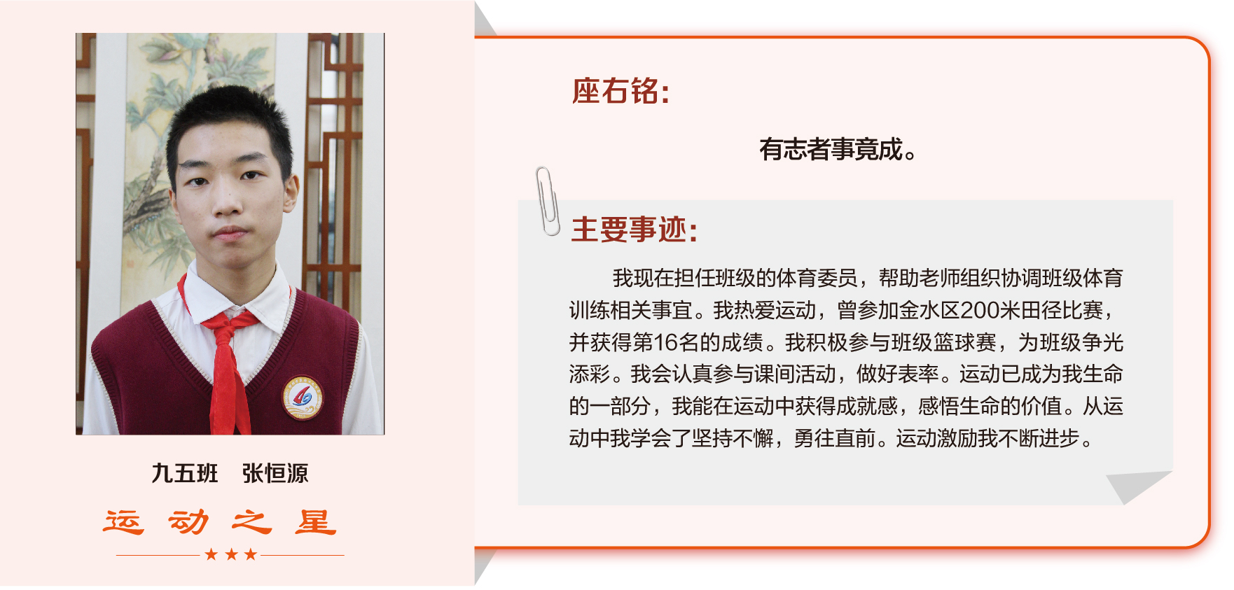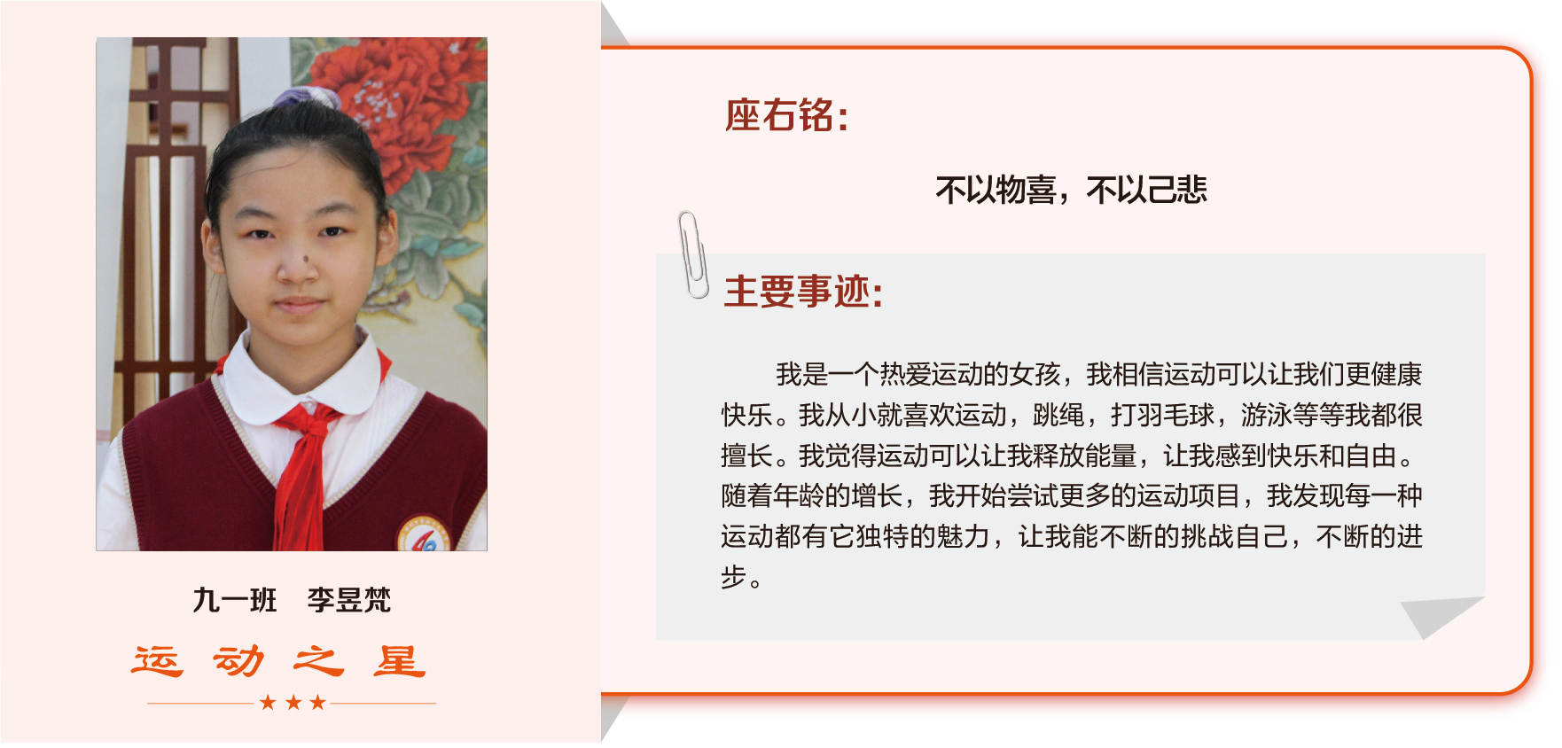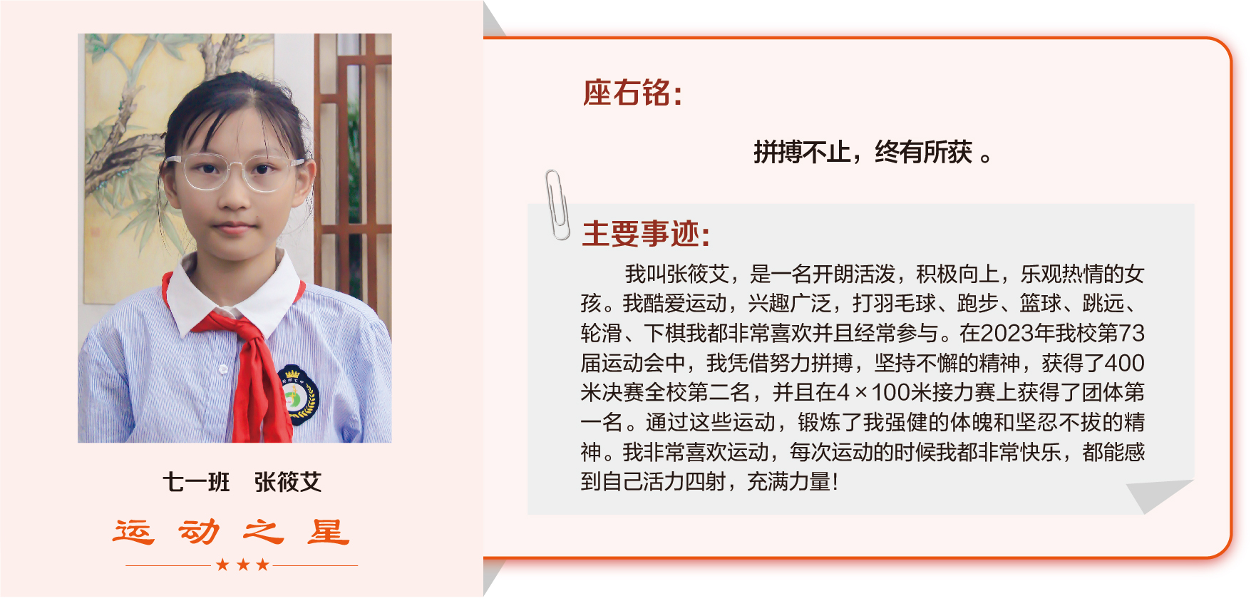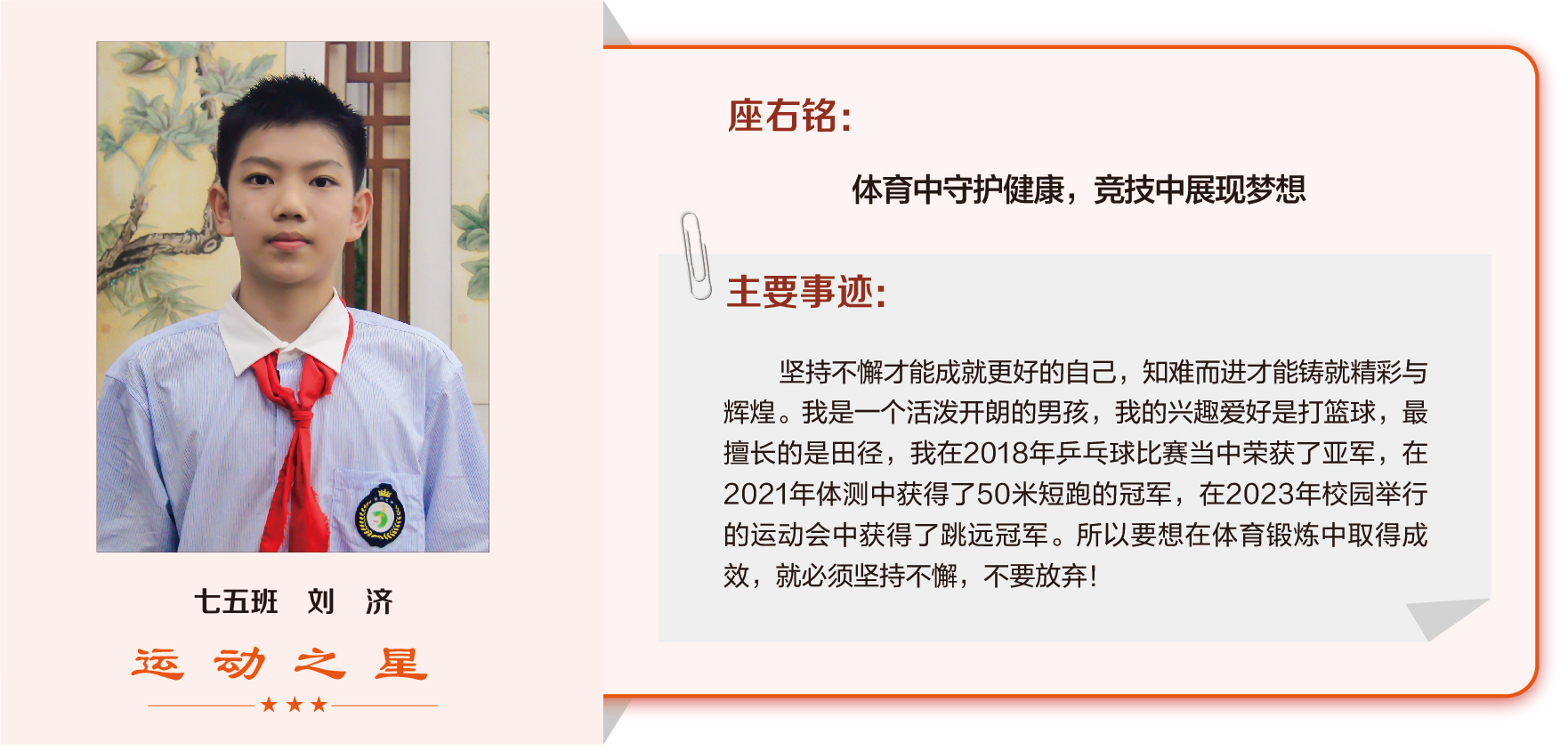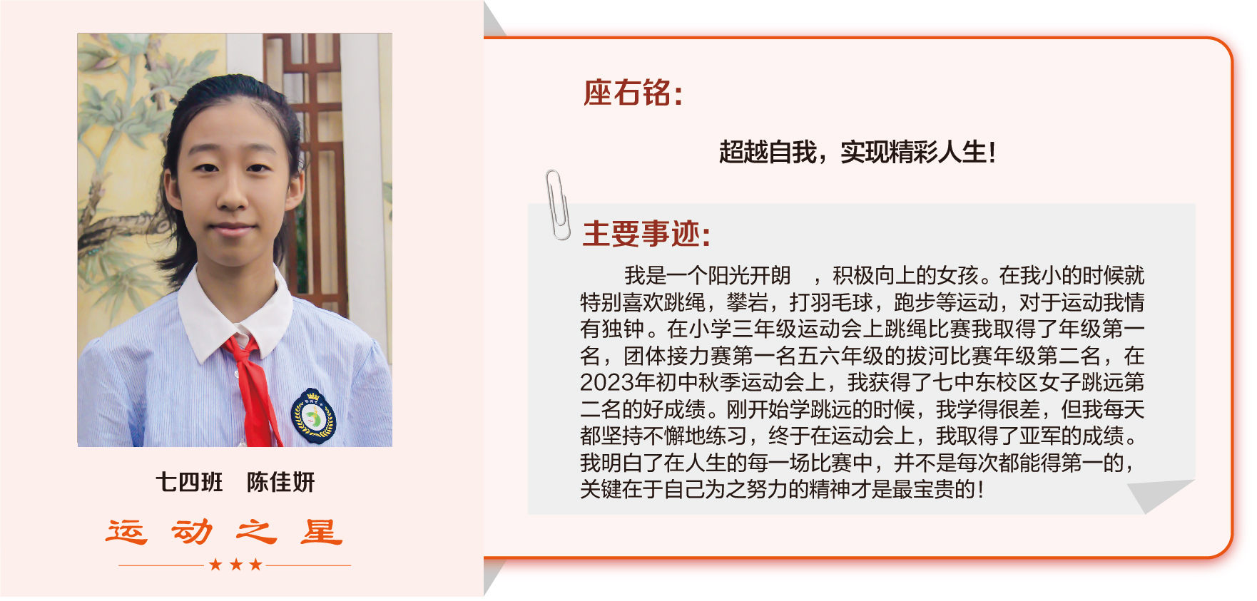 他们在运动会期间为班级争光,奔跑在运动场上,他们认真做眼保健操,大课间整齐跑步,口号响亮,经个人申报,班级推荐,学校审核评选出本期《运动之星》。