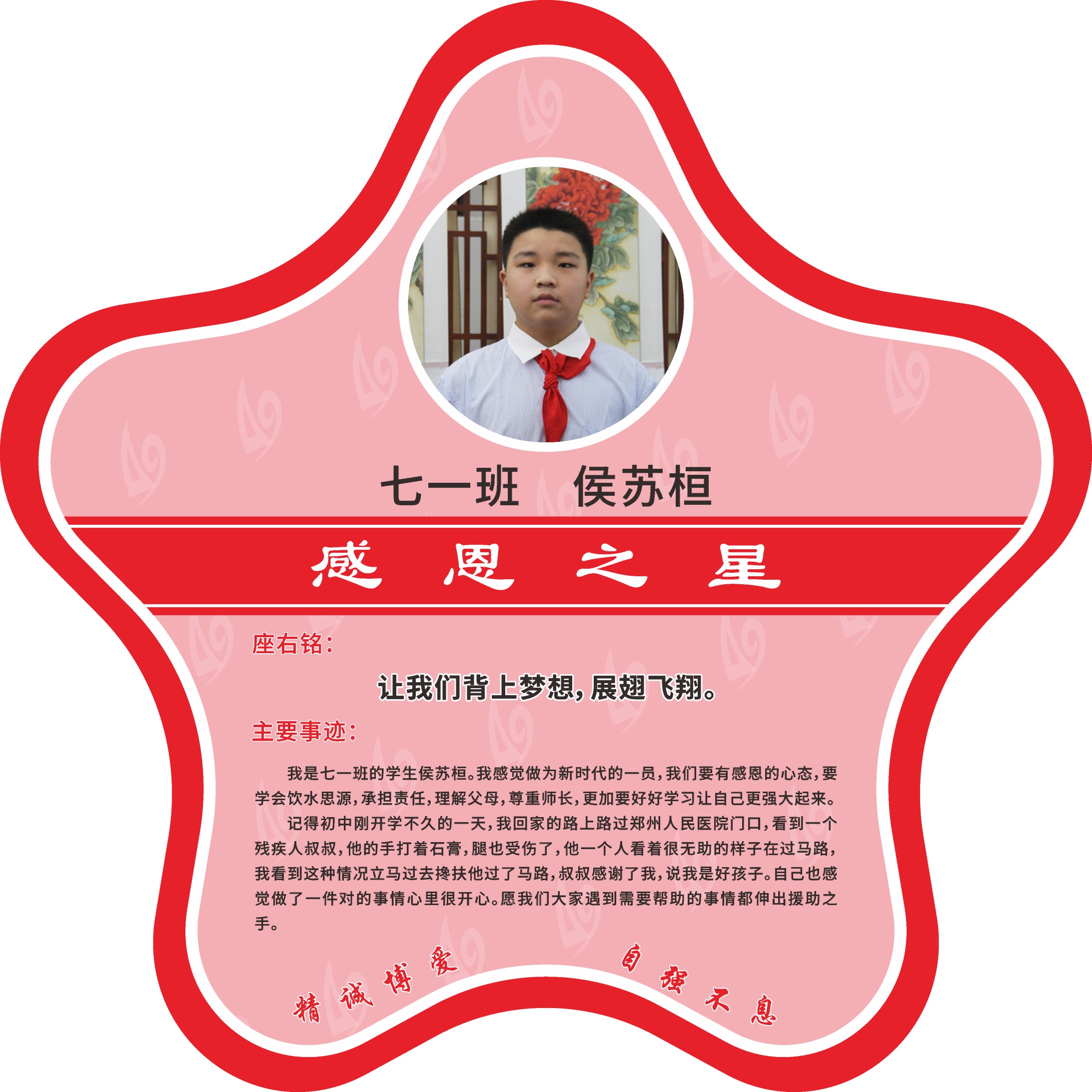 感知身边的幸福与美好,日常生活中理解父母,以实际行动感恩父母,尊重老师,努力学习,感念老师的悉心指导,饮水思源,承担责任,对同伴、对家庭、对社会传递阳光和温暖。现经个人申报,班级推荐,学校审核,评选出2022年11月《感恩之星》。
