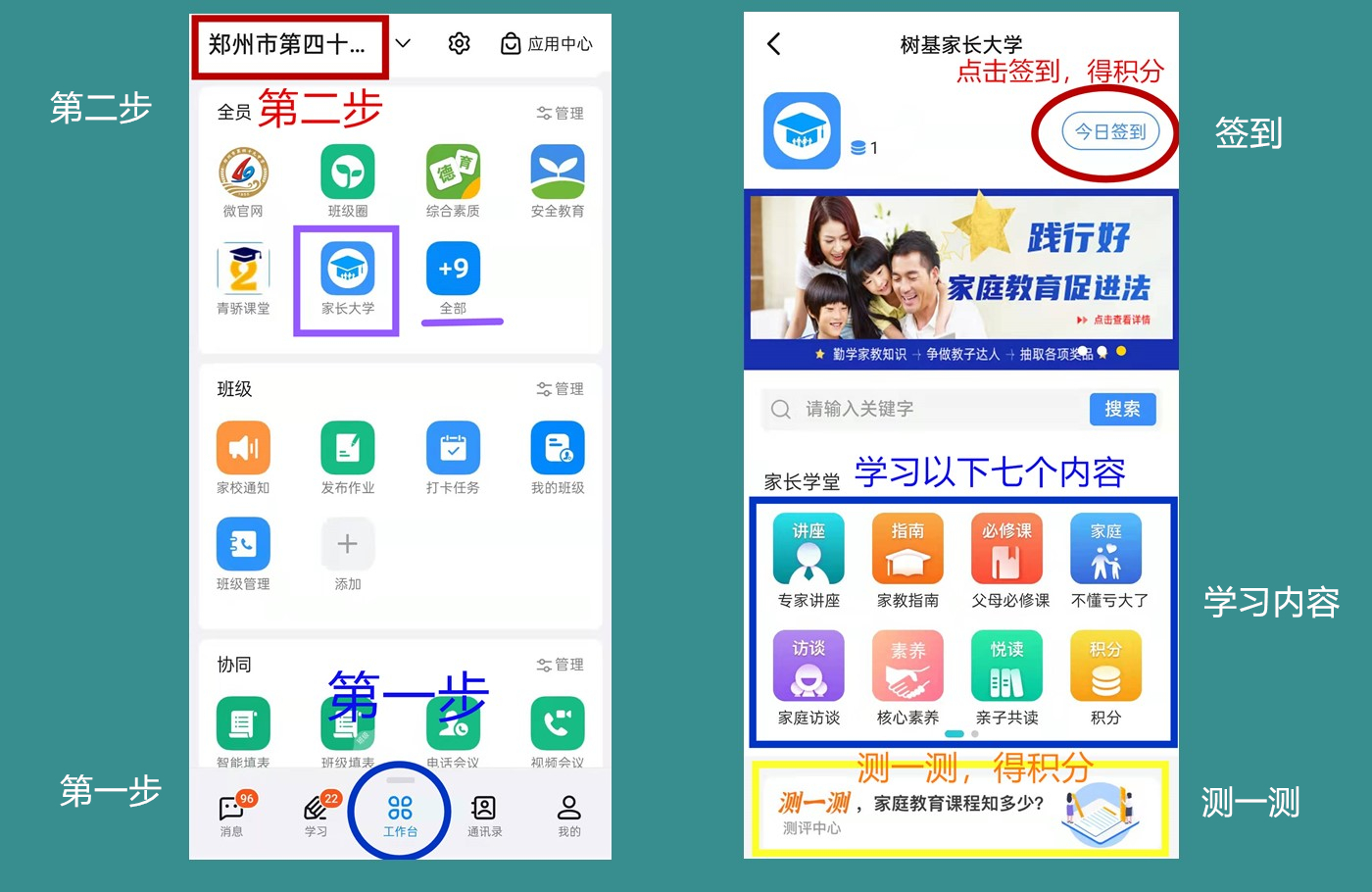 第三步:进入《家长大学》,学习“父母必修课、家教指南、家庭访谈、核心素养、亲子共读、专题讲座、案例分析、精品推荐”等栏目,每一个模块均有专业录制的音频或视频供家长在线观看学习,同时,还可以点击“测一测、签到”,系统将自动记录学习积分。