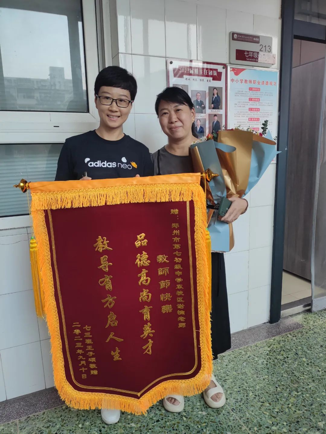 润物无声,育人无痕。9月11日上午,郑州市第七初级中学东校区七年级三班某学生家长满怀感恩之心,把绣有“品德高尚育英才,教导有方启人生”的锦旗送到学校,以此表达对学校和班主任谢楠老师给予孩子无微不至关怀的感谢。