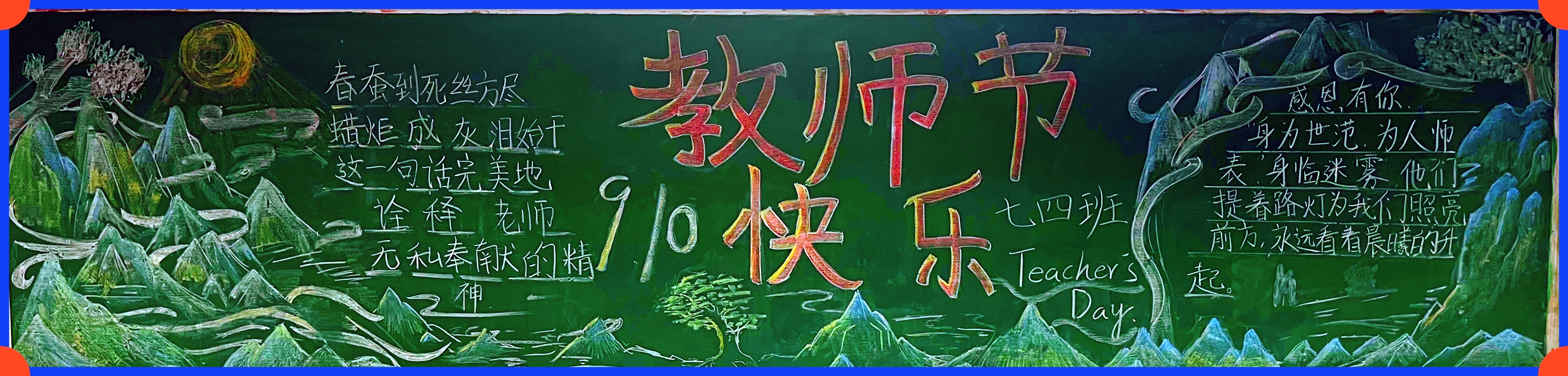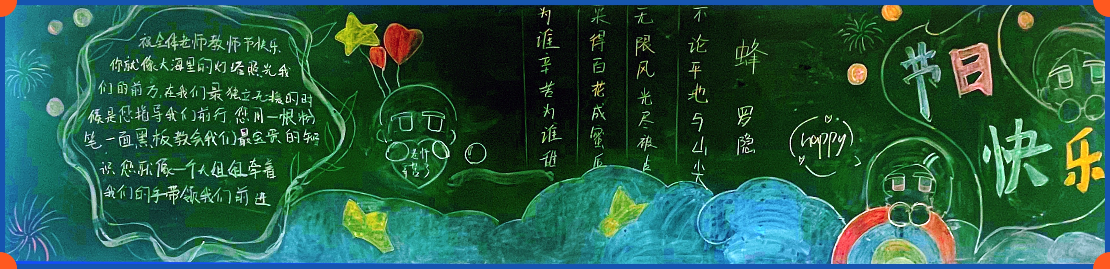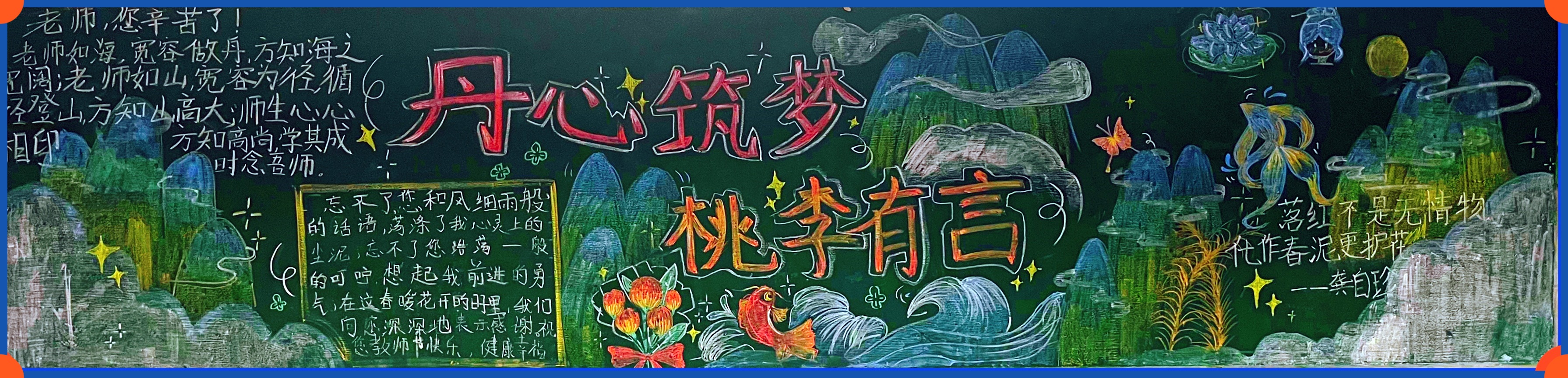 同学们怀着对老师崇高的敬意和满腔的热情,积极参与主题板报绘制。经过同学们精心策划,一幅幅构思新颖、主题鲜明、图文并茂的黑板报完美呈现在师生眼前,成为一道靓丽的班级风景线。在板报绘画过程中,同学们既展现了设计和绘画才能,也用笔墨丹青表达了对教师的感恩和祝福。