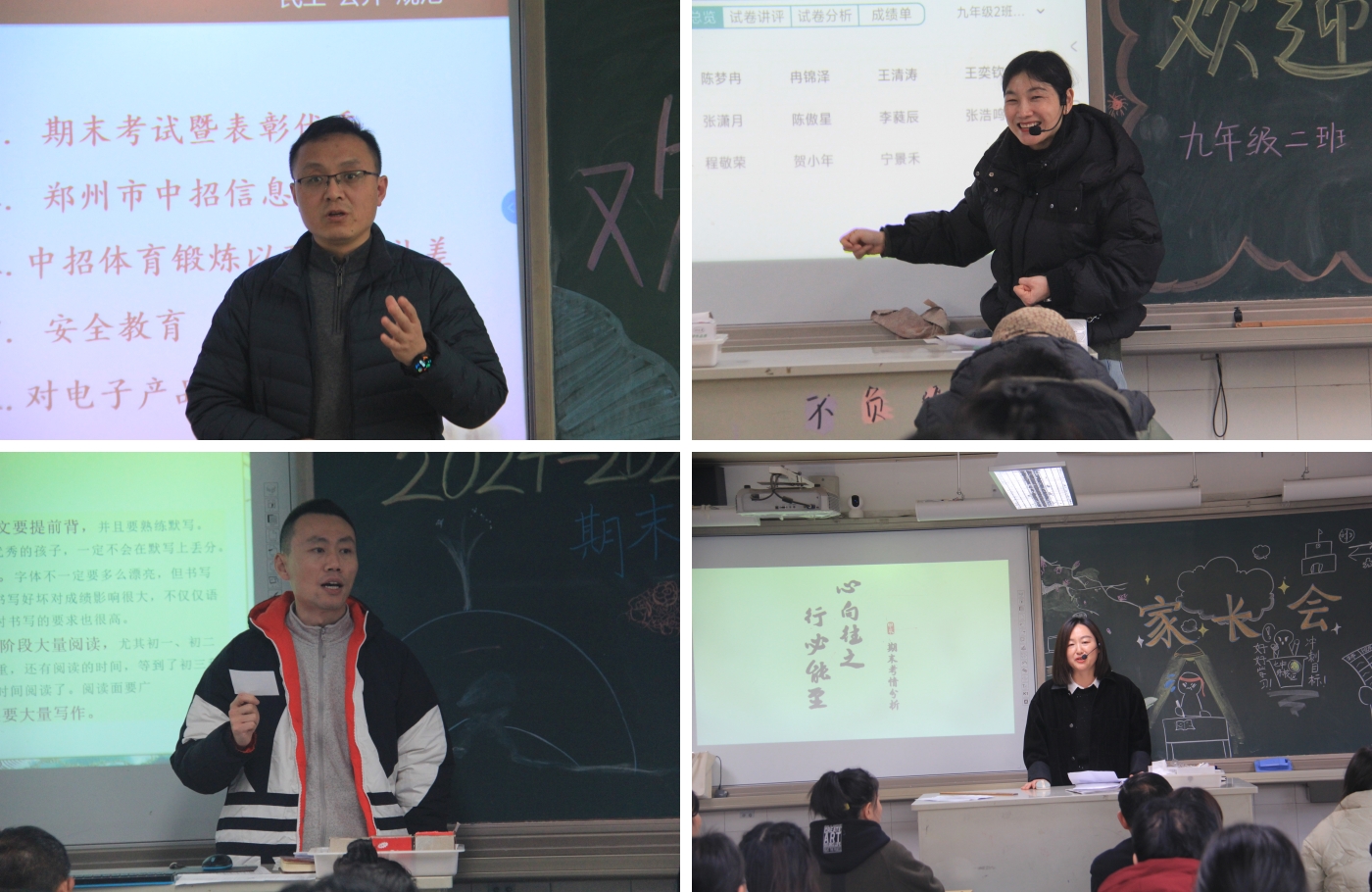 家长学校结束后,七、八、九年级各班召开了家长会,班主任就本学期的活动开展、班级工作、班级建设及学生成长等方面展开讲述,在学习方面,班主任和科任老师分别指出问题并给出审题训练、知识梳理等建议,各班级邀请优秀学生代表发言,分享自己的学习心得;安全方面,临近寒假,班主任老师再次详细解读消防、交通等各类安全准则,提醒家长务必重视孩子假期在家的安全教育工作;习惯培养上,倡导学生在家多进行家务劳动、课外阅读等,假期管控电子产品;亲子沟通中,班主任老师剖析不良亲子模式并指导家长正确沟通,营造和谐的家庭氛围,保证孩子身心健康发展。