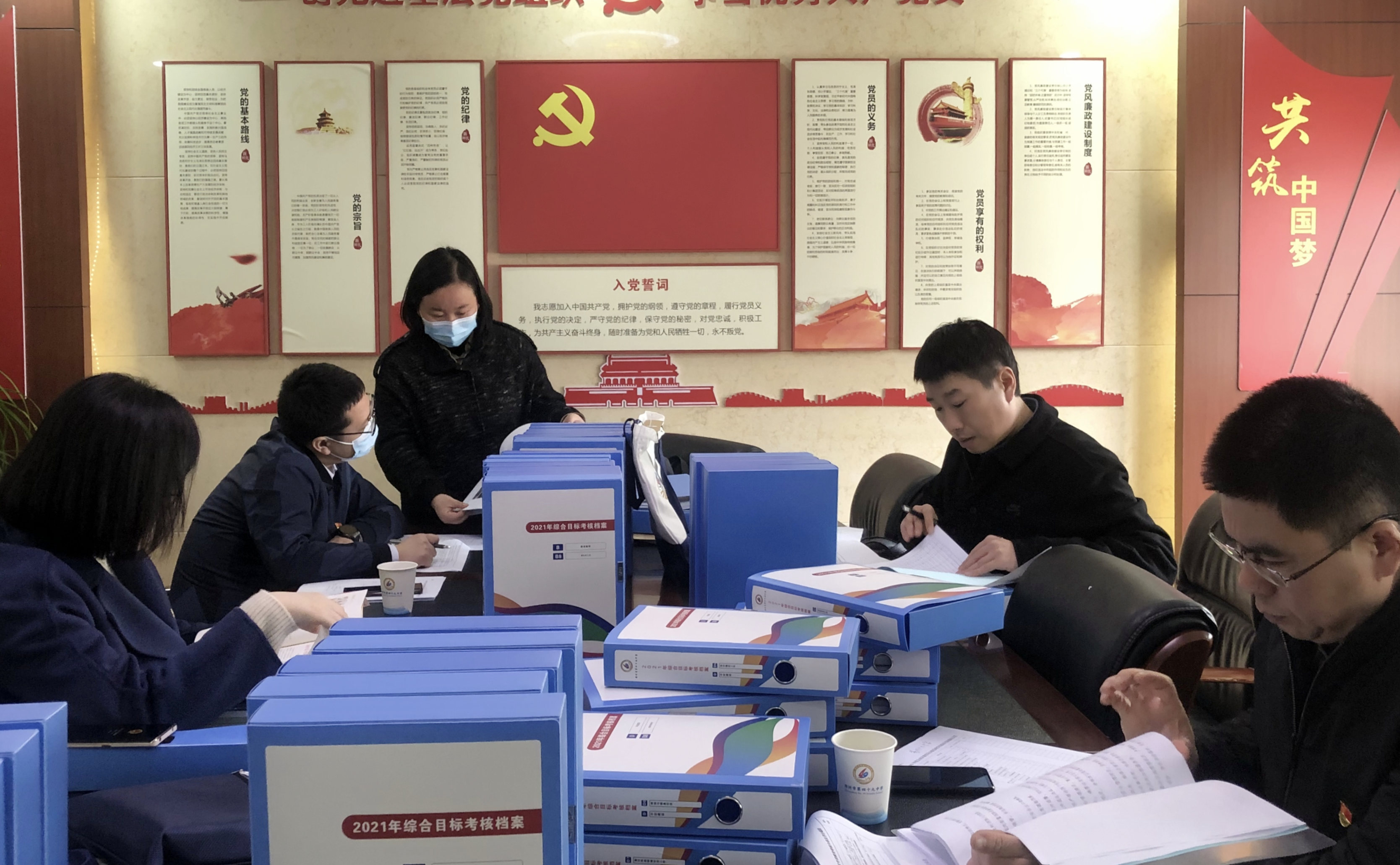 考核组在会议室查阅年度资料