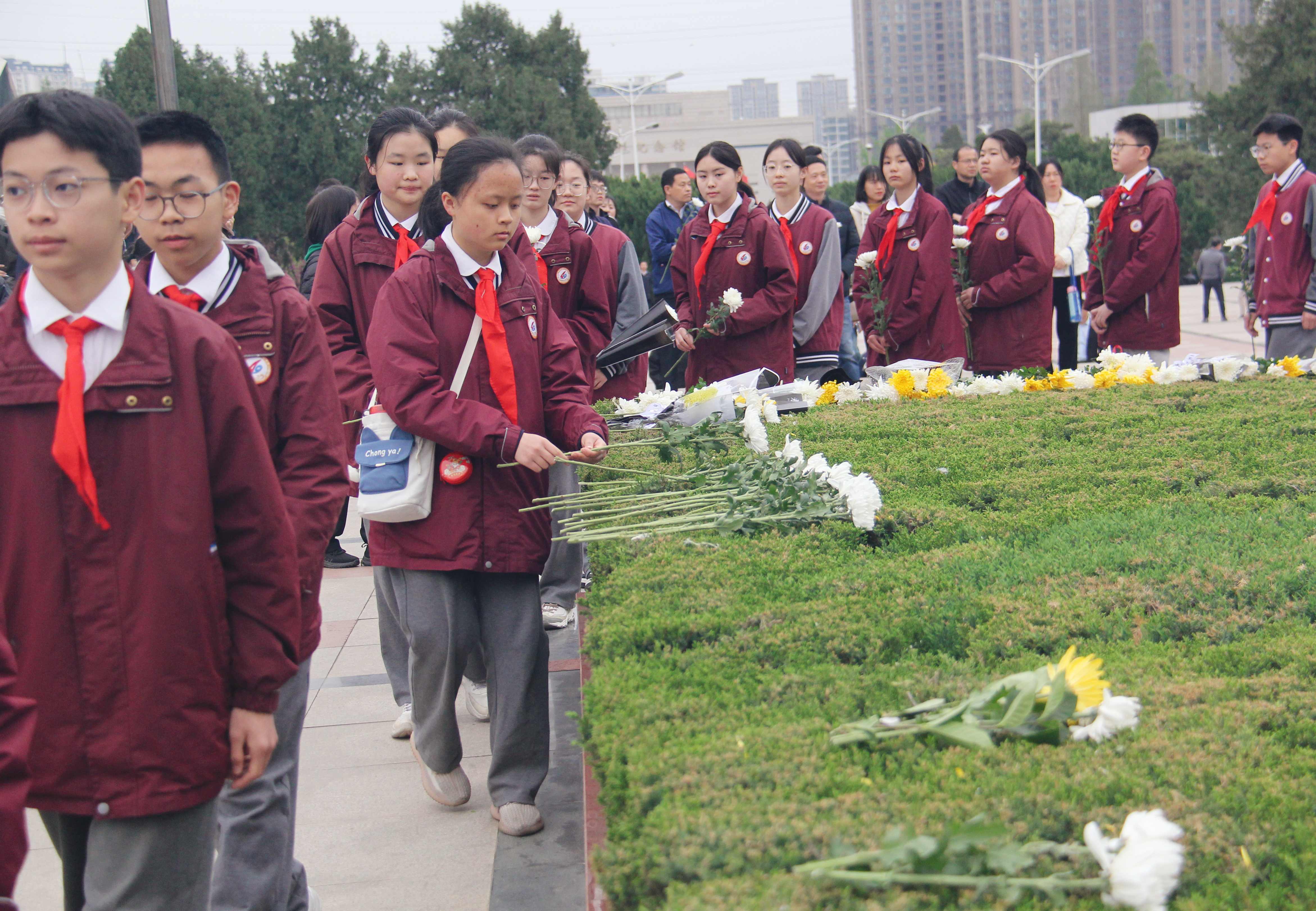 随后,师生依次缓步绕行至烈士纪念碑前敬献鲜花。