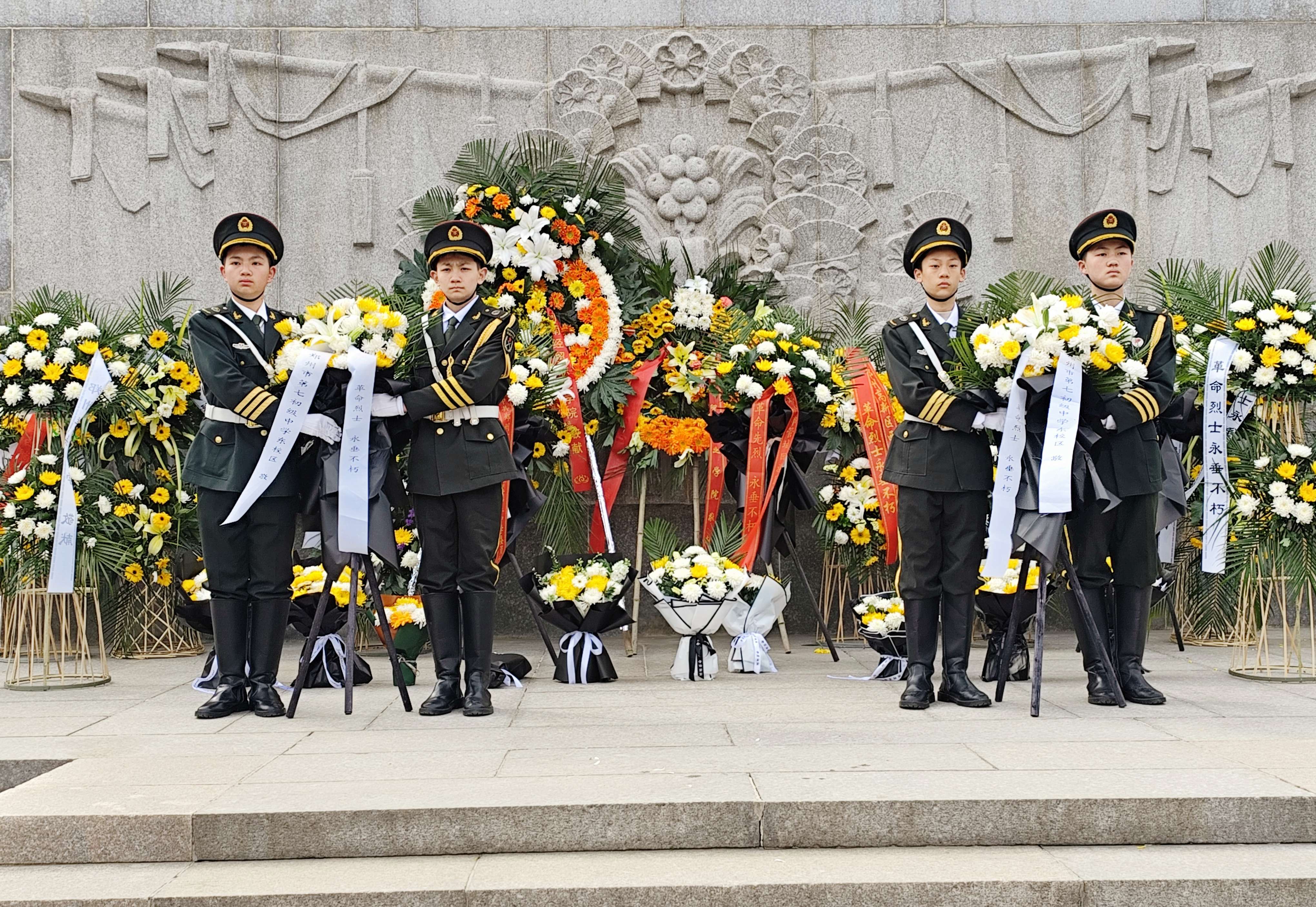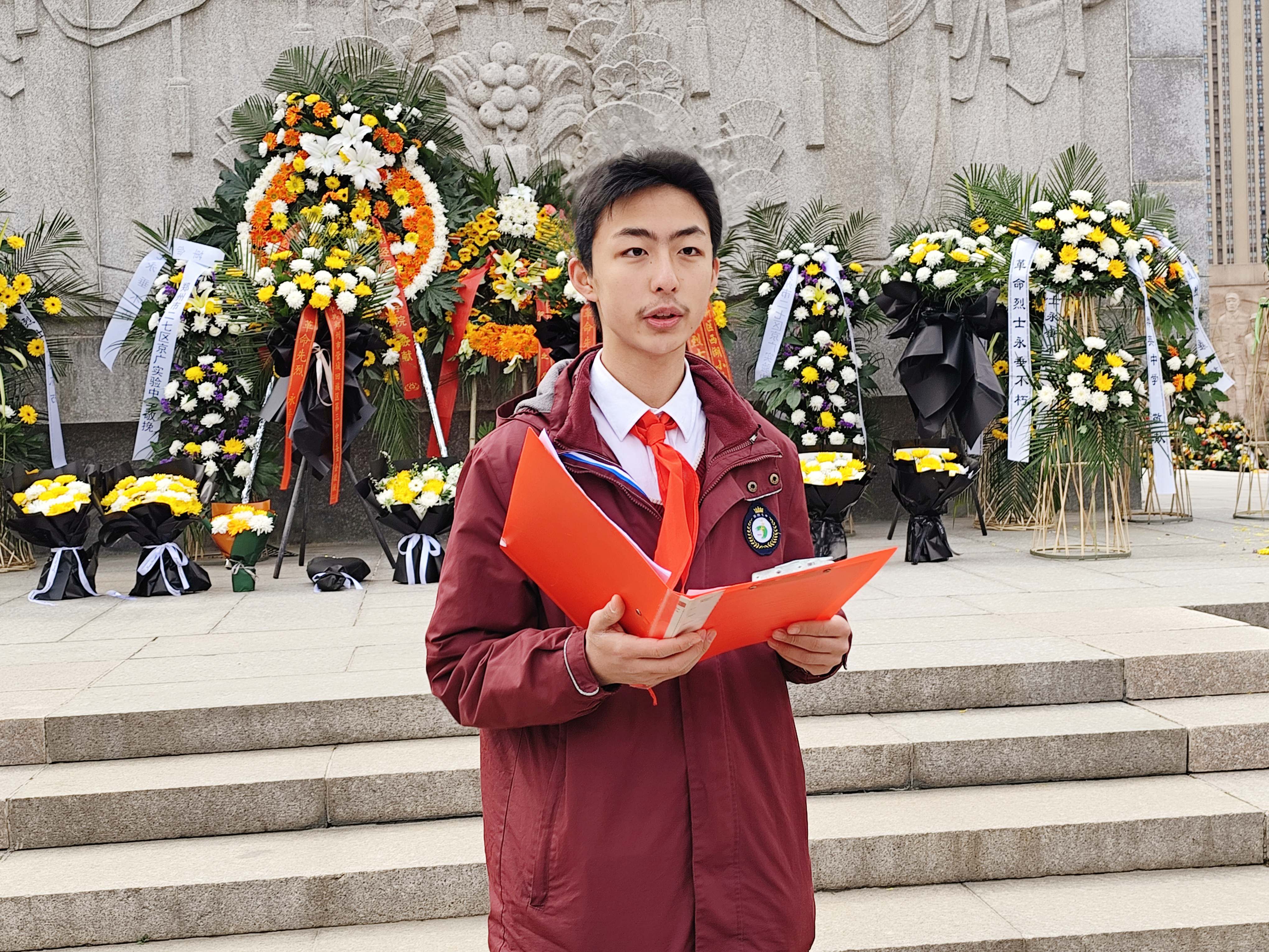 伴随着雄壮的国歌声,学生代表向烈士纪念碑敬献花圈,花圈上的挽联寄托着同学们对革命先烈的无限敬仰和哀思。随后,全体师生肃立默哀一分钟,在这庄严肃穆的氛围中,同学们仿佛穿越时空,感受到烈士们为了国家和人民抛头颅、洒热血的英勇事迹。