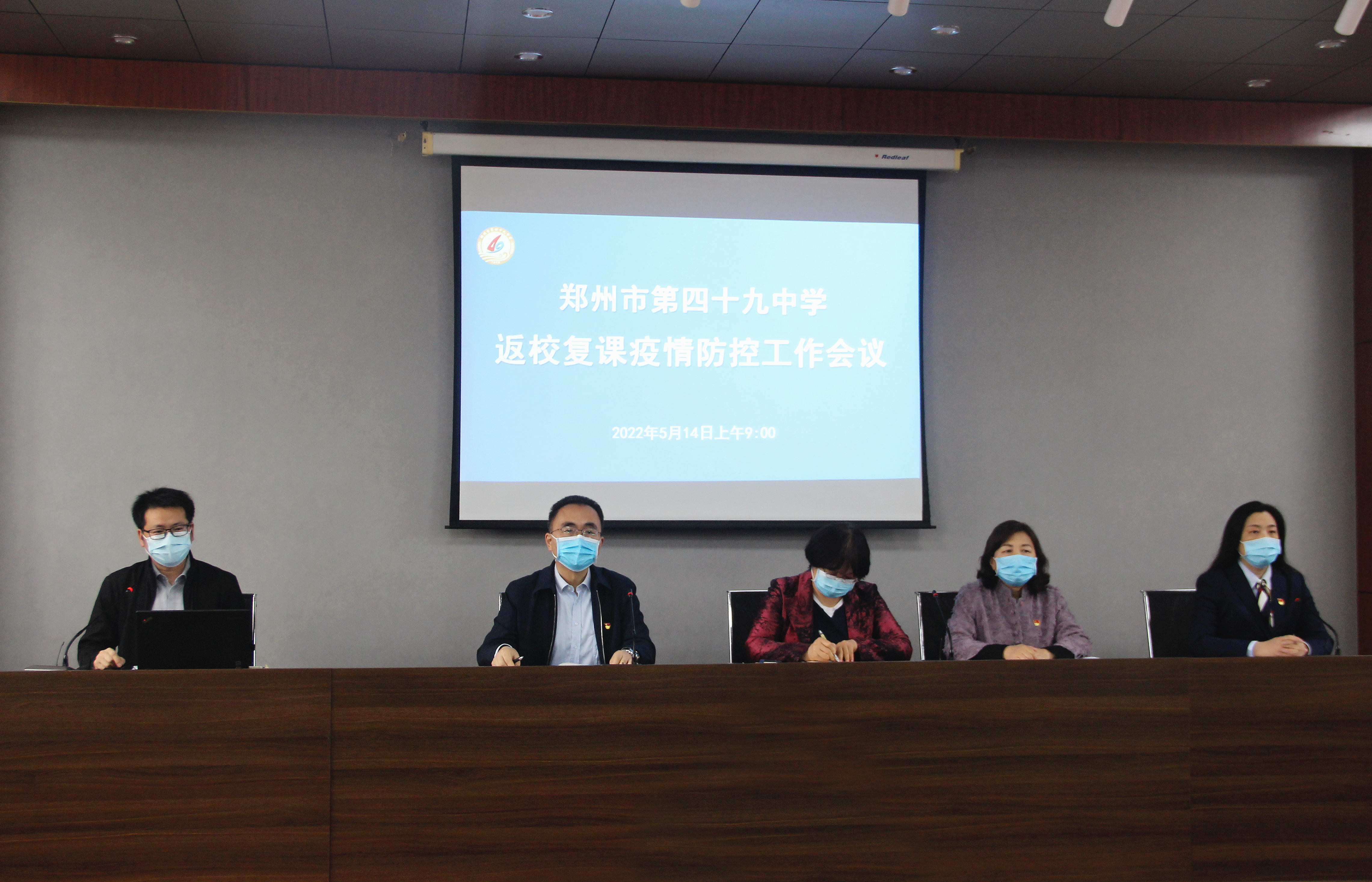 为有效落实郑州市教育局5月11日-12日郑州市中小学、幼儿园分期分批分类、错峰措施错区域返校复学通知,结合金教防控专班〔2022〕4号文件精神,郑州市第四十九中学根据当前的防疫形于5月14日上午九点在六楼会议室召开返校复课疫情防控工作会议,学校中层以上干部、班主任和全体行政人员按照间隔一米就坐,其余教师通过钉钉平台参与线上会议。