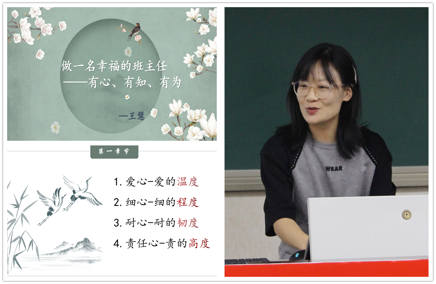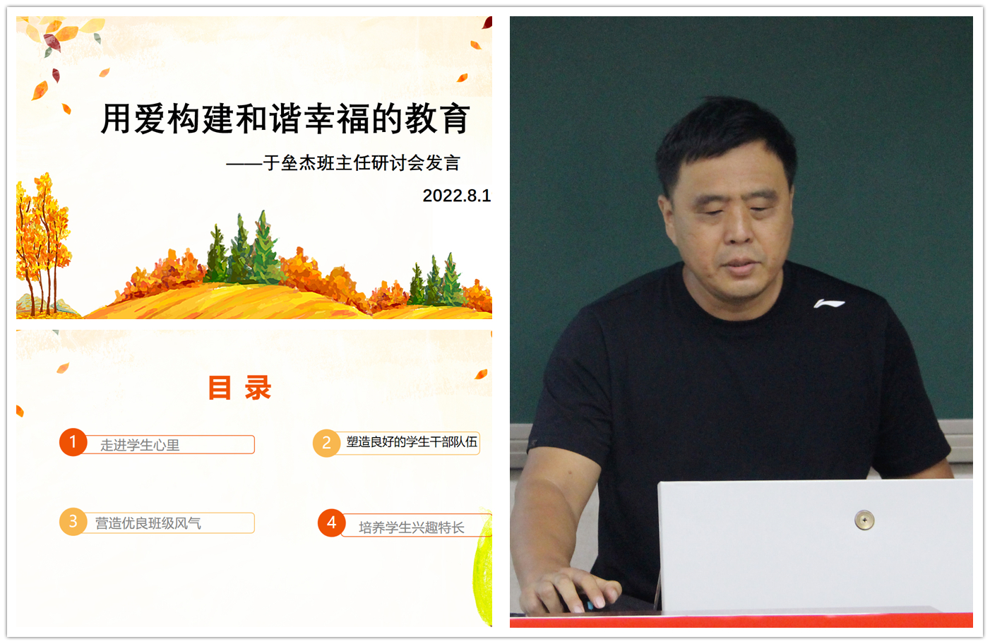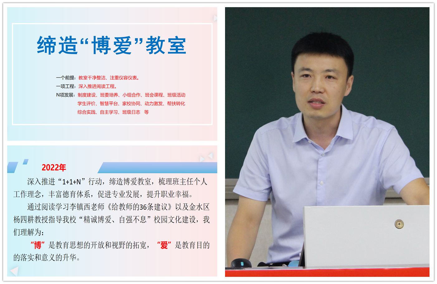 政教主任徐光辉,解读了缔造博爱教室“1+1+N”行动策略。总结了过去一年的班主任工作,学习李镇西老师《给教师的36条建议》,从有快乐、有收获、有故事、有成长等方面丰富班级文化,开展班级建设。