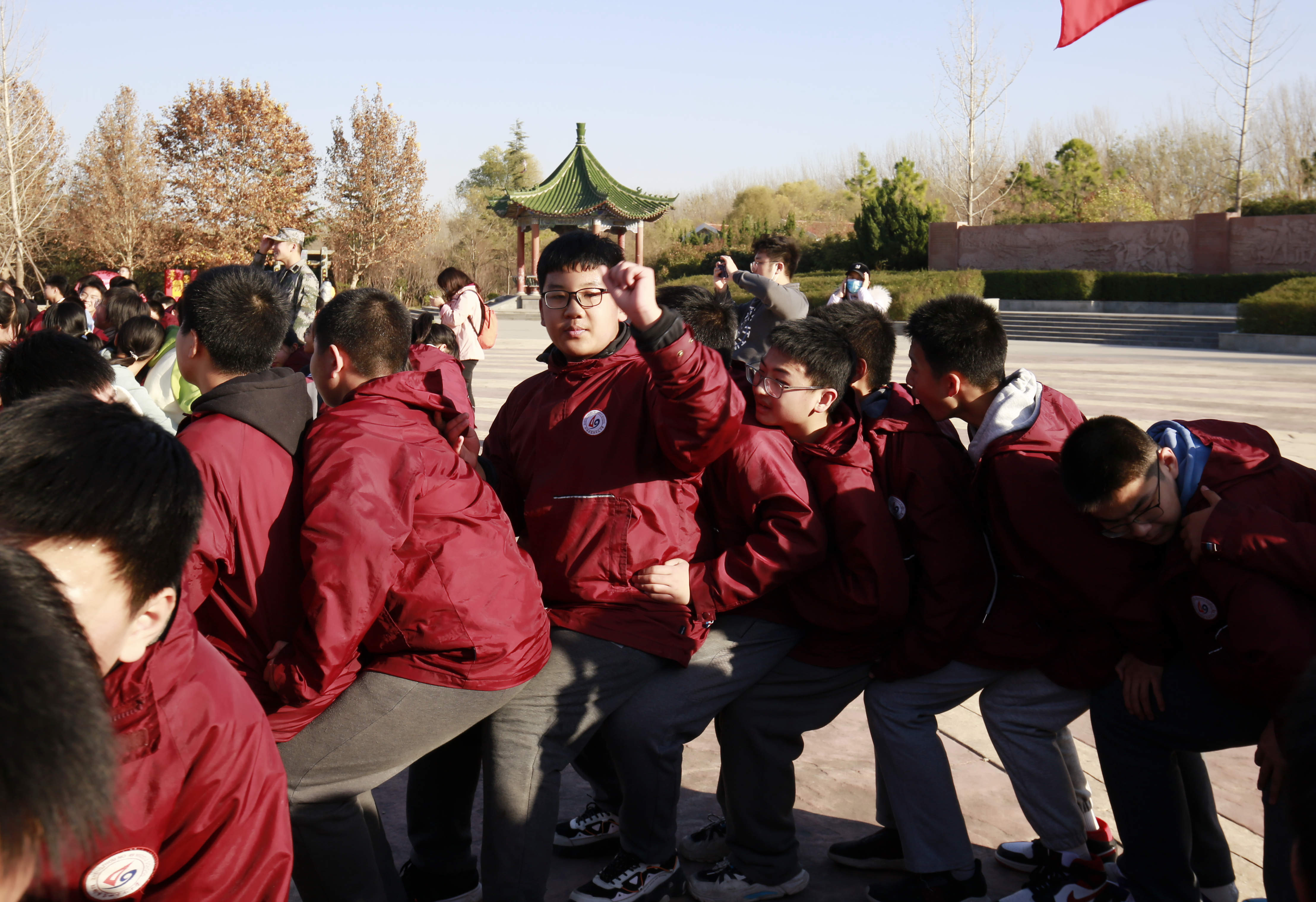 经过近4小时的徒步,师生抵达花园口记事广场。在老师的组织下,同学们首先学习了解花园口事件,进行爱国主义教育并结合学习内容,开展 “万里长城”项目拓展,明确责任与担当。